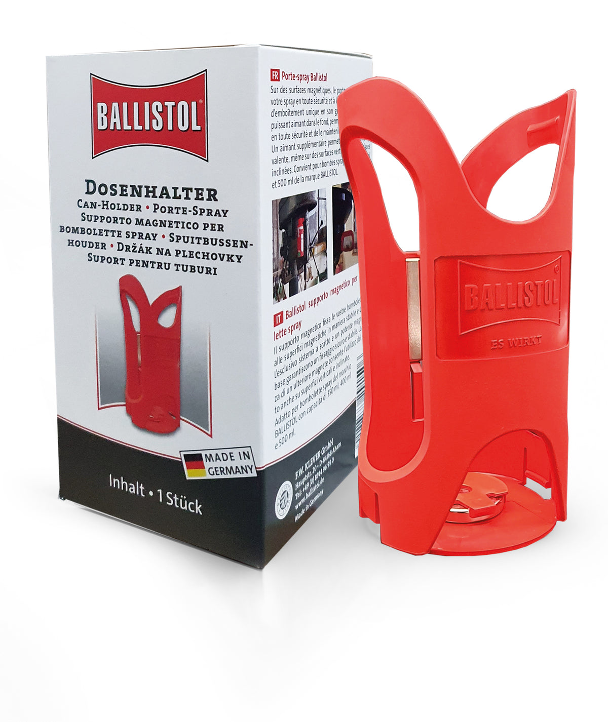 Der Ballistol Dosenhalter mit Magnet sorgt für Ordnung und schnellen Zugriff in Werkstatt, Garage oder unterwegs. Dank starkem Magnet haftet der Halter sicher an metallischen Oberflächen – ganz ohne Bohren oder Schrauben. Passend für alle gängigen Spraydosen (z. B. Ballistol 200 ml / 400 ml). Robust, stabil und immer griffbereit.