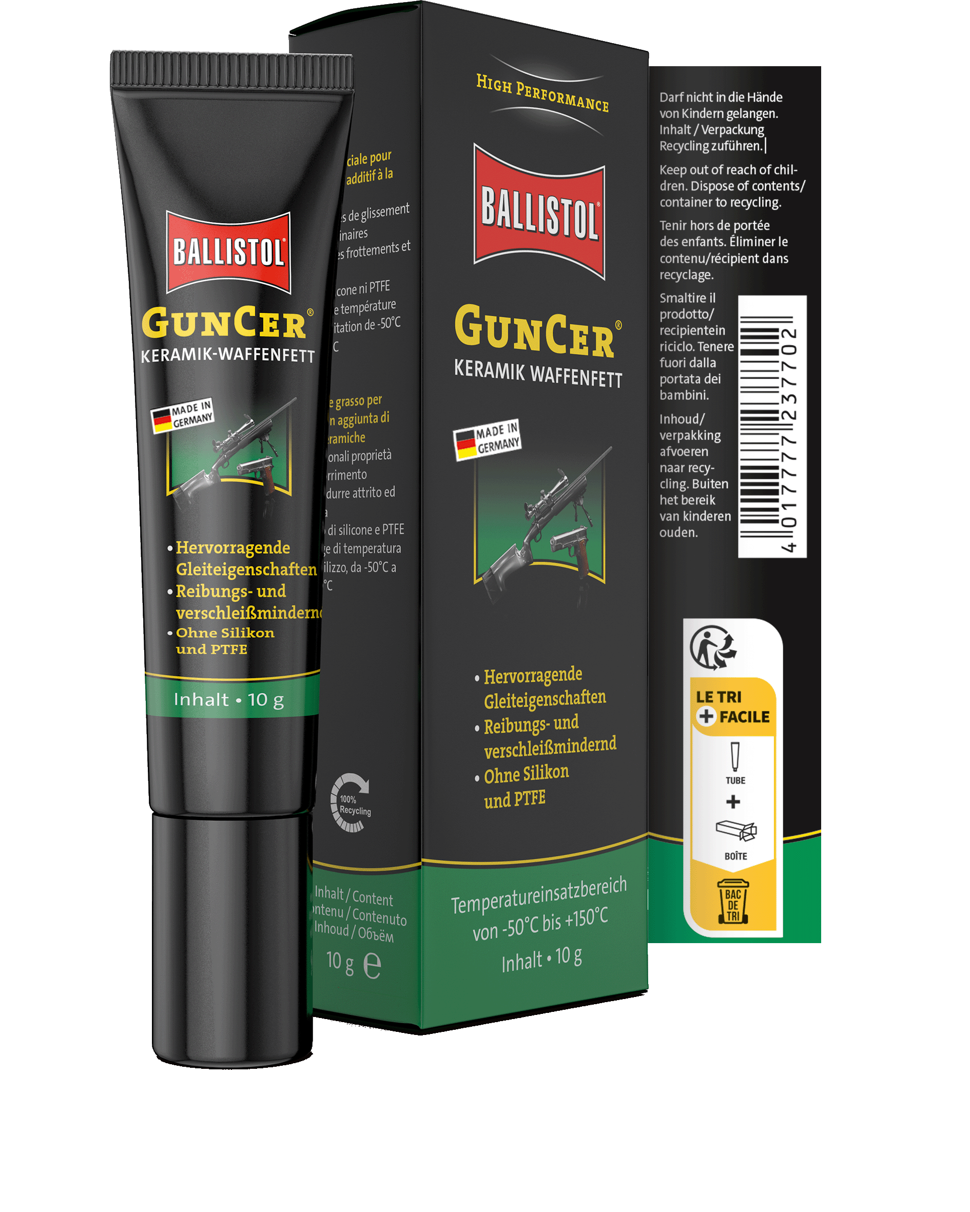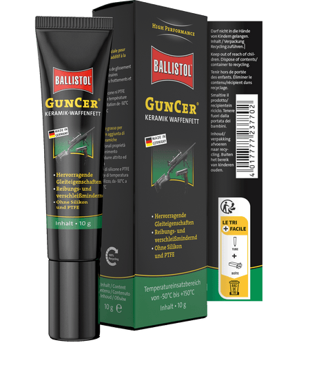 Ballistol GunCer Keramik Waffenfett ist ein spezialisiertes Schmierfett für hochbelastete Waffenkomponenten wie Verschlüsse, Führungen und bewegliche Metallverbindungen. Die enthaltene Hochleistungs-Keramik sorgt für eine extrem belastbare Schmierwirkung selbst unter starkem Druck, hoher Reibung und extremen Temperaturen. Es schützt zuverlässig vor Verschleiß, Korrosion und Festfressen – selbst bei längeren Standzeiten oder intensiver Nutzung.