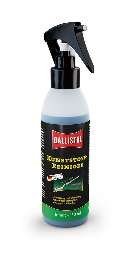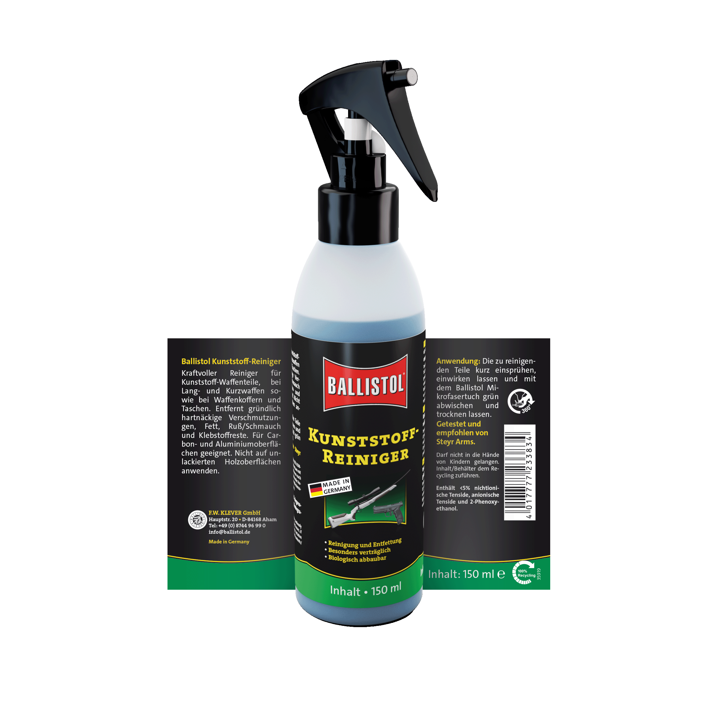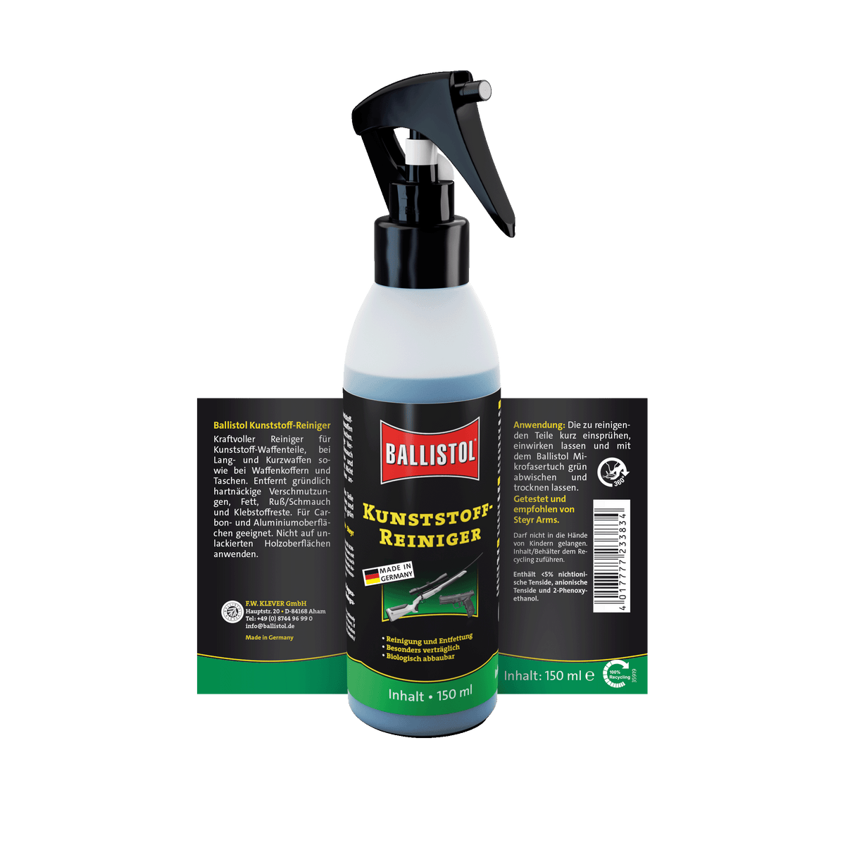 Der Ballistol Kunststoff-Reiniger ist ein schonender, aber effektiver Reiniger zur Pflege und Säuberung von Kunststoff-, Gummi- und lackierten Oberflächen. Er entfernt mühelos Staub, Schmutz, Fett und Nikotinablagerungen, ohne die Materialien anzugreifen oder auszutrocknen. Ideal für Waffen, Haushaltsgeräte, Fahrzeuge, Elektronikgehäuse, Möbel und vieles mehr.