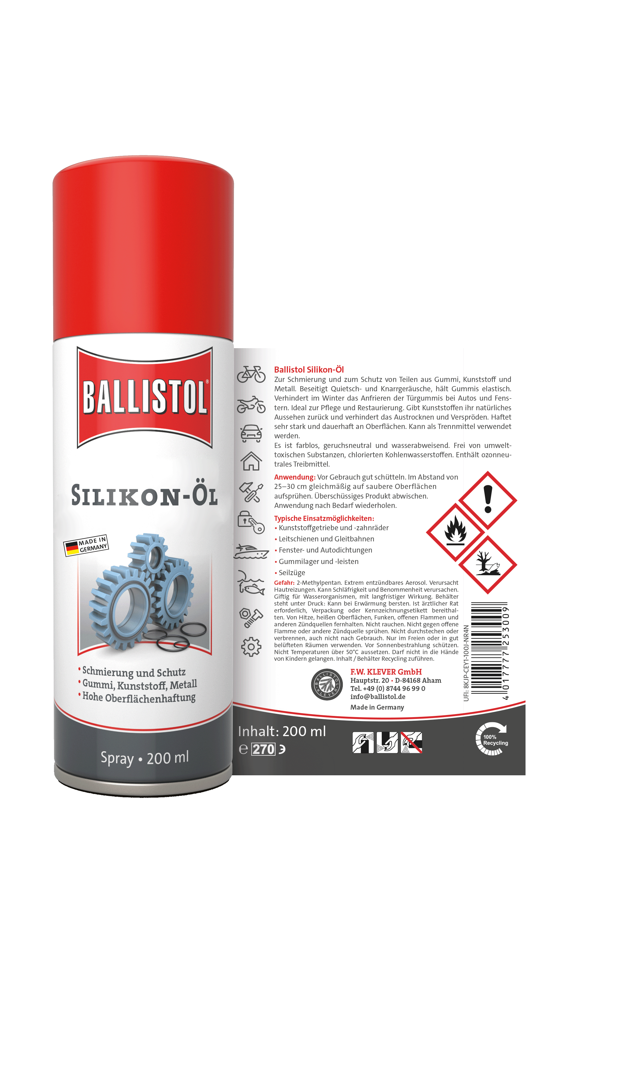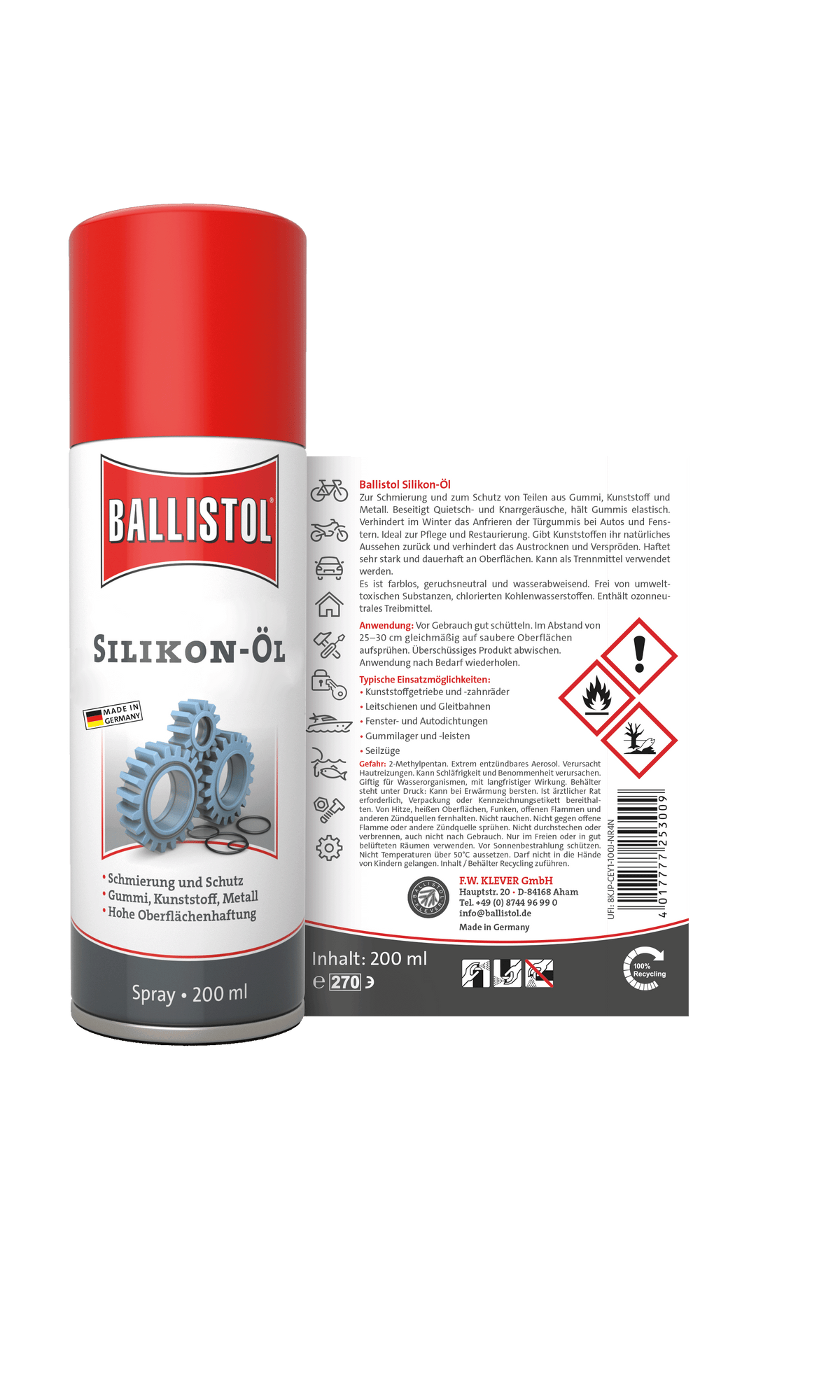 Das Ballistol Silikon-Öl Spray ist das ideale Gleit- und Pflegemittel für Kunststoff, Gummi, Metall und viele andere Materialien. Es schützt vor Versprödung, wirkt wasserabweisend und sorgt für langanhaltende Gleitfähigkeit – ohne zu verharzen. Perfekt für bewegliche Teile, Dichtungen, Scharniere, Lauf- und Führungen im Haushalt, Kfz- und Industriebereich.