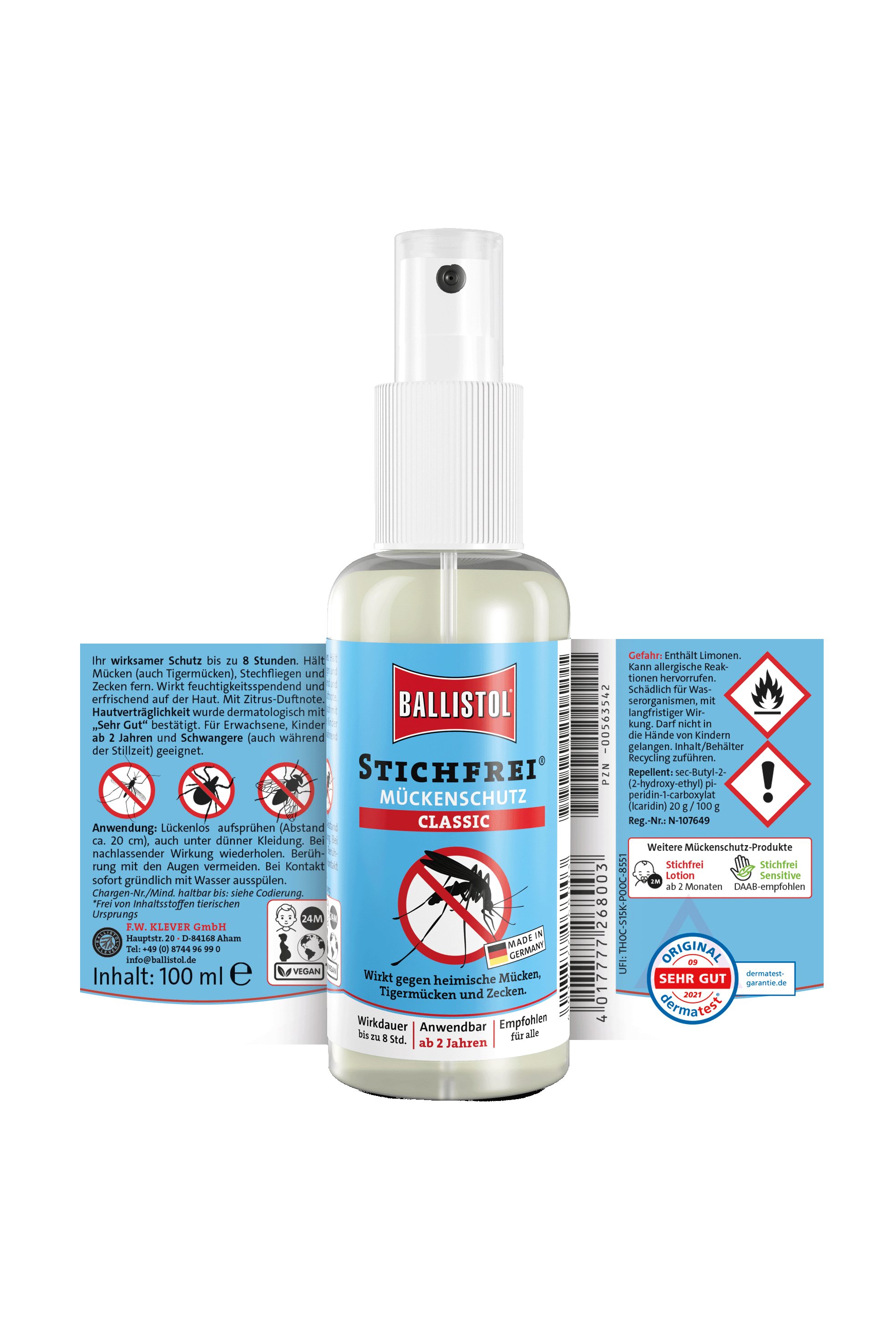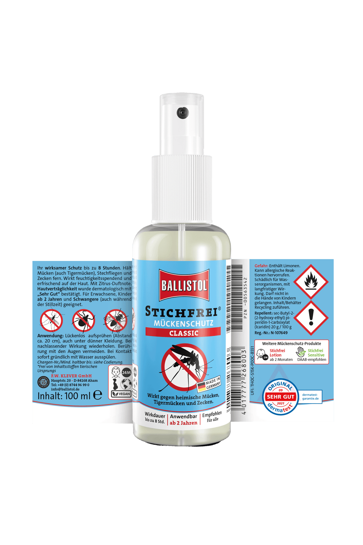 Ballistol Stichfrei Classic bietet langanhaltenden Schutz vor Mücken, Zecken, Bremsen und anderen stechenden Insekten – bis zu 8 Stunden. Die bewährte Formel pflegt gleichzeitig die Haut mit natürlichen Inhaltsstoffen wie Jojobaöl und Vitamin E. Ideal für Outdoor-Aktivitäten, Reisen, Gartenarbeit oder Jagd. Dermatologisch getestet und für Kinder ab 2 Jahren geeignet.