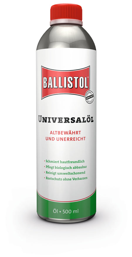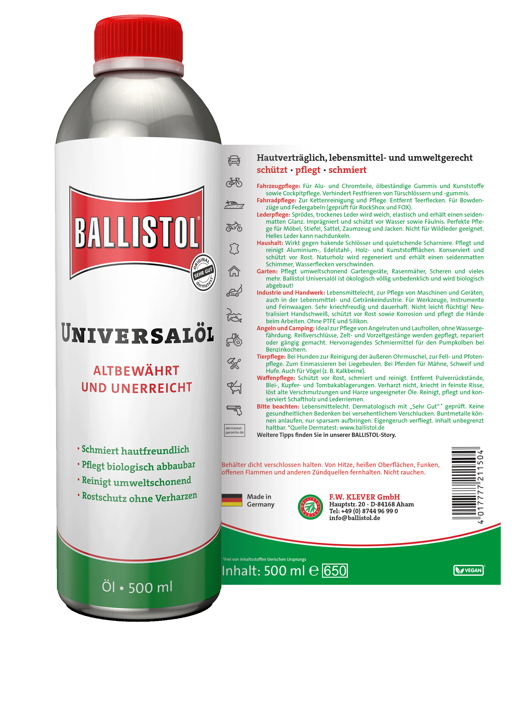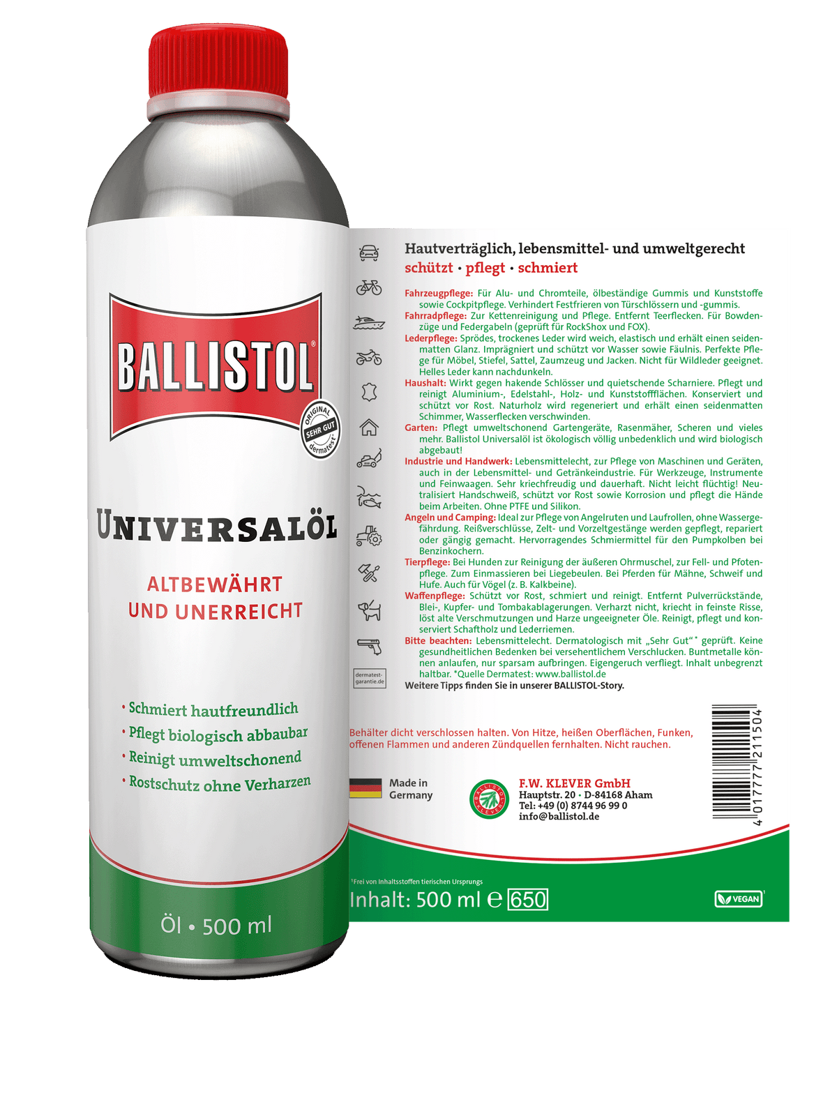 Ballistol Universalöl Flüssig ist das bewährte Allzwecköl für Reinigung, Pflege und Schutz – vielseitig einsetzbar in Haushalt, Handwerk, Industrie, Hobby und Outdoor. Es schützt zuverlässig vor Rost, reinigt gründlich, pflegt nachhaltig und konserviert langfristig. Ideal für Metall, Holz, Leder, Gummi, Kunststoff und sogar Haut. Das Öl ist biologisch abbaubar, lebensmittelecht (NSF-zertifiziert) und medizinisch rein.