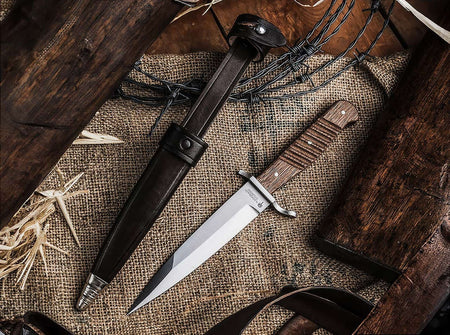 Diese Neuauflage zeigt ausgewählte Designmerkmale der damaligen Zeit: eine robuste Klinge aus nicht‐rostfreiem Kohlenstoffstahl (C75), ein markanter Handschutz aus Edelstahl, geriffelte Holzgriffschalen für sicheren Halt, eine authentische Lederscheide sowie eine fortlaufende Seriennummer, die jede Ausgabe individualisiert.
