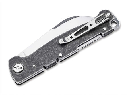 Die Klinge besteht aus D2-Werkzeugstahl, der besonders schnitthaltig, robust und verschleißfest ist. Der Griff aus Edelstahl mit Dark-Stonewash-Finish bietet stabilen Halt und eine elegante, widerstandsfähige Optik. Durch den Backlock-Verschluss wird die Klinge sicher arretiert, während der Nagelhau eine klassische und zuverlässige Öffnung ermöglicht. Ein Tip-Up Taschenclip erlaubt den bequemen Transport am Gürtel oder in der Tasche.