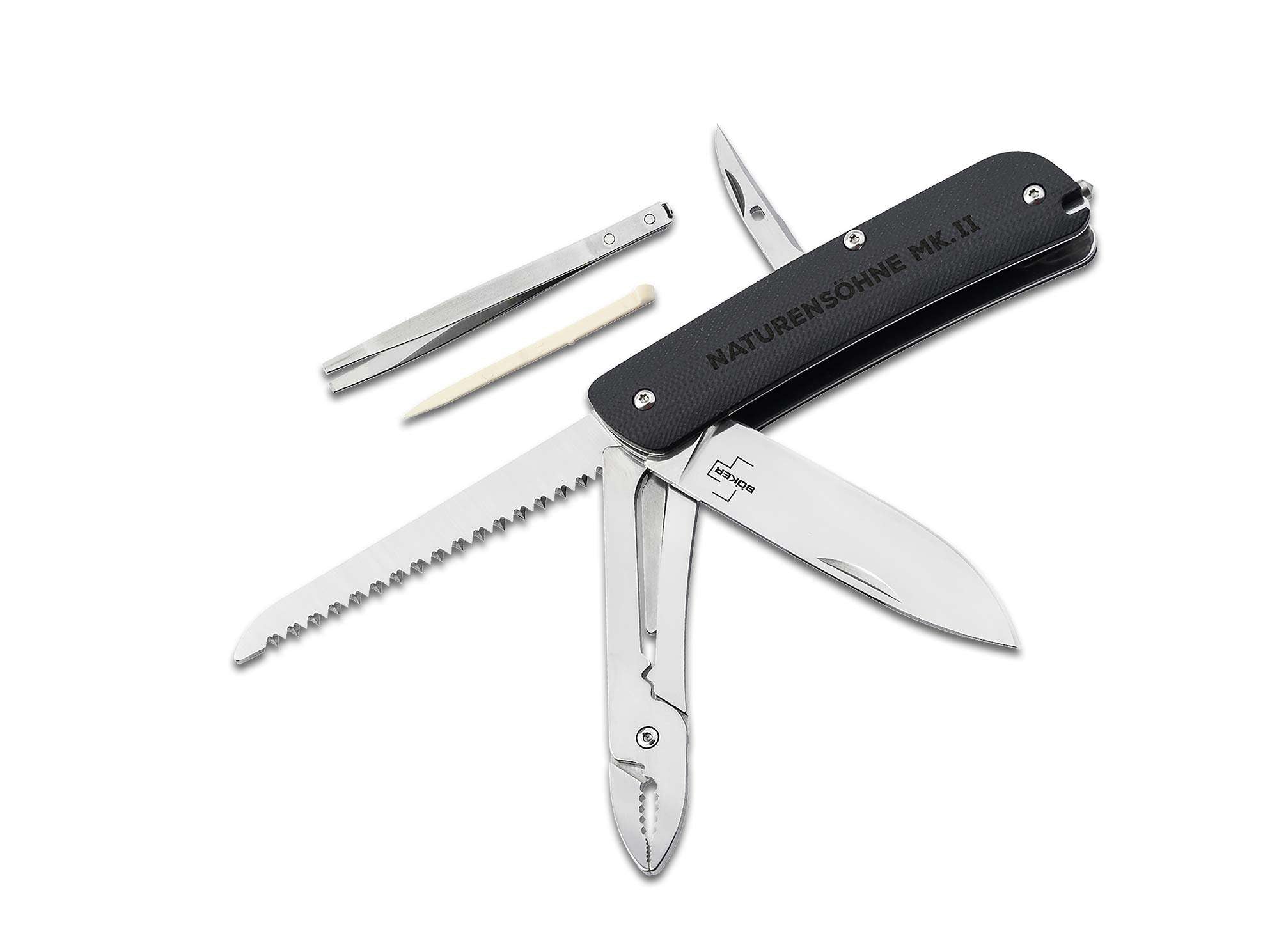 Bei der Teilnahme an der 3. Staffel des YouTube-Erfolgsformats 7 vs. Wild, bei dem sieben Teams mit selbst gewählten Ausrüstungsgegenständen in der Wildnis überleben müssen, vertraut das Team Naturensöhne auf ein weiteres Messer aus dem Hause Böker. Gerrit und Andy schätzen die zahlreichen Funktionen, die das kompakte Multifunktionstaschenmesser Böker Plus Naturensöhne MK. II vereint. Die Ausstattung dieses Sondermodells wurde exakt auf die Vorstellungen und Wünsche der beiden Berliner abgestimmt, so dass nur die essenziellen Werkzeuge für den 14-tägigen Aufenthalt in Kanada enthalten sind. Die Hauptklinge stellt die perfekte Ergänzung für feine Schneidaufgaben zum robusten feststehenden Messer dar. Dank des Hohlschliffs eignet sich die Klinge aus dem schwedischen Sandvik-Stahl 12C27 für alle feineren Schneid- und Schnitzarbeiten aber auch z.B. zum Ausnehmen von Fischen. Die robuste Zange hilft beim Lösen von Knoten aber auch dem Biegen von Draht und beim Bauen von Shelter und co. sowie ggf. dem Drehen von Sechskantschrauben und Überwurfmuttern. Welche Situationen und Gegenstände als Hilfsmittel den Teilnehmern begegnen werden, weiß schließlich niemand. Die praktische Holzsäge zerkleinert Äste mit einem sauberen Schnitt; mühelos und materialschonend. Auch zum Durchtrennen von Röhrenknochen, Hirschhorn und Kunststoff ist die Säge durch Stahlqualität und Zahnstellung geeignet. Dank der enthaltenen Näh-/Bohrahle lassen sich Löcher in Holz, Knochen, Hirschhorn und Kunststoff bohren, verkrustete Knoten aufstechen, Löcher in Leder stechen und Ritzen und Nuten bearbeiten oder freikratzen. Dezent in den beiden schwarzen G10 Schalen versteckt, gewährleistet ein Zahnstocher aus Kunststoff die nötige Outdoorhygiene. Dornen, Splitter und ähnliches entfernt die auf der gegenüberliegenden Seite untergebrachte Pinzette. Glasbrecher sowie ein praktischer Deep-Carry-Taschenclip sind natürlich serienmäßig Bestandteil eines jeden Tech-Tools.