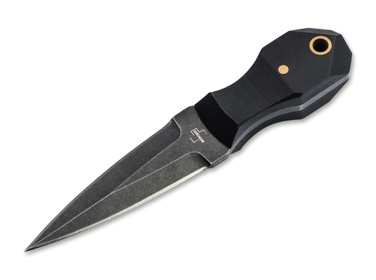 Die Klinge aus D2-Werkzeugstahl ist doppelseitig geschliffen (Dolchform) und mit Black-Stonewash-Finish versehen – robust, schnitthaltig und optisch dezent. Der ergonomische Griff aus G10 liegt sicher in der Hand, bietet rutschfesten Halt und ist mit Messingnieten akzentuiert. Eine der Nieten dient gleichzeitig als Lanyard-Öse für Halskette oder Paracord.