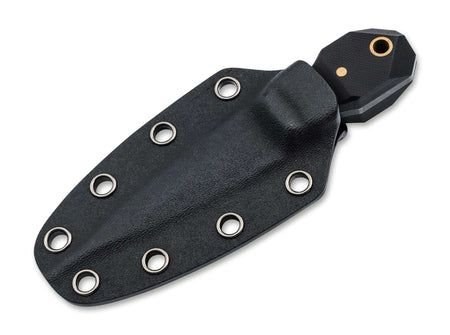 Das Messer wird mit einer Kydex-Scheide und Kugelkette geliefert, sodass es direkt am Hals getragen werden kann, jederzeit griffbereit ist und gleichzeitig sicher verwahrt bleibt.