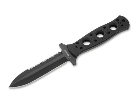 Das Böker Plus Steel-Mariner eignet sich perfekt für den maritimen Einsatz. Die Klinge des Tauchermessers besteht aus rostfreiem 440C und ist komplett titanbeschichtet, was die Korrosionsbeständigkeit nocheinmal deutlich erhöht. Die obere Schneide verfügt über einen sehr effektiven großflächigen Wellenschliff zum raschen Trennen von Seilen, Netzen und anderen Gewebematerialien. Die untere Schneide ist für präzises und feines Schneiden durchgehend glatt geschliffen. Die griffigen G10-Schalen liegen sehr gut und rutschsicher in der Hand, und die Fangriemenöse schützt das Messer vor Verlust. Ausgeliefert wird das Böker Plus Steel-Mariner mit einer hochwertigen Kydex-Scheide und einem passenden Gürteladapter.