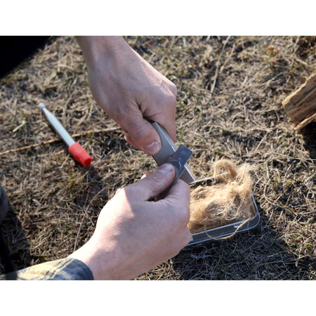 > enthält Zündstahl, Schaber, Magnesiumblock, Blasrohr und Jute