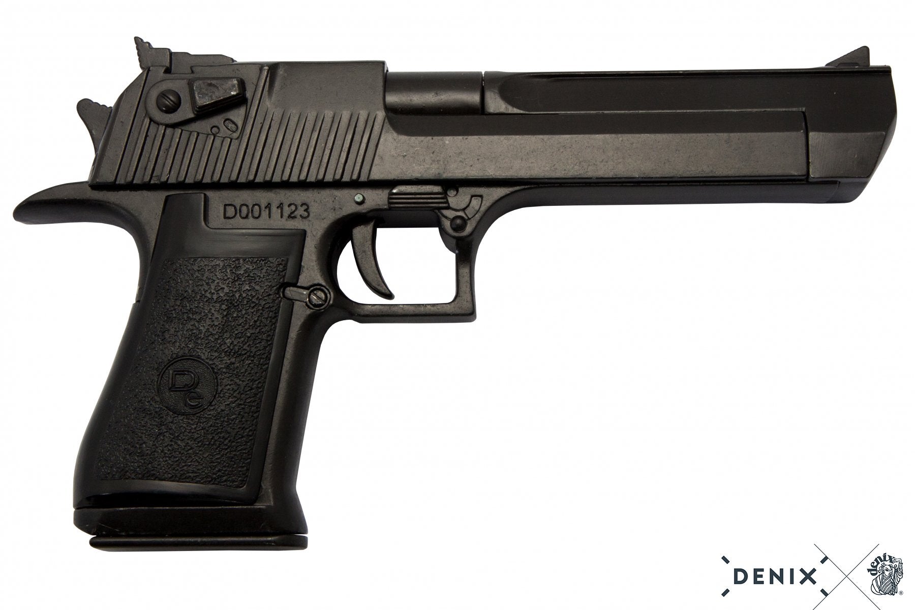 Authentische, hochwertige Dekor‑Replik der legendären Desert Eagle im Kaliber .50AE. Diese detailreiche Nachbildung richtet sich an Sammler, Film‑ und Bühnenausstatter sowie Dekor‑Liebhaber, die Wert auf realistische Optik und Haptik legen — ohne Schuss‑ oder Funktionsmöglichkeit. Massives Erscheinungsbild, präzise Gravuren und sorgfältige Oberflächenverarbeitung machen die Replik zu einem eindrucksvollen Ausstellungsstück.