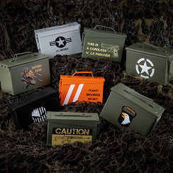 Robuste Munitionskiste aus Stahl im klassischen US-Military-Stil, veredelt mit einem individuellen Design. Ideal zur sicheren Aufbewahrung von Munition, Werkzeug, Ausrüstung oder als stylisches Sammler- und Deko-Objekt.