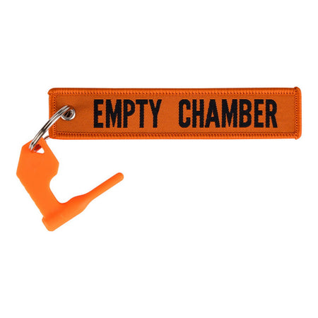 Auffälliger Stoff-Schlüsselanhänger mit der Aufschrift „Empty Chamber“ und orangefarbenem Stopfen für die leere Gewehrkammer. Dient als gut sichtbare Sicherheitsflagge und erinnert daran, vor dem Schießen zu entfernen – zugleich ein stylisches Accessoire für Schlüsselbund oder Tasche.
