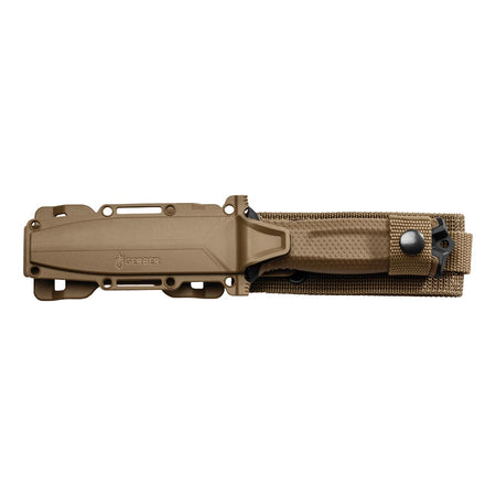 Mit der STRONGARM-Serie bietet Gerber Messer für den robusten, taktischen oder auch militärischen Einsatz an. Die Fulltang-Klinge ragt über das Griffende hinaus und kann als Schlagdorn eingesetzt werden. Als Material wurde beschichteter, rostfreier Stahl 420 verarbeitet. Dem taktischen Einsatzgebiet entsprechend, verfügt die Klinge über einen Teilwellenschliff und eignet sich somit auch gut zum Durchtrennen z. B. von Seilen. Der geriffelte Kunststoffgriff gewährt auch in feuchterer Umgebung einen sicheren Halt. Die modulare Kunststoffscheide mit zusätzlichen Nylonriemen erlaubt unterschiedliche Tragemöglichkeiten, auch an Ausrüstung mit MOLLE-System.