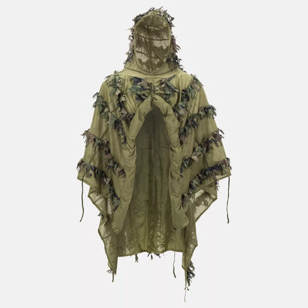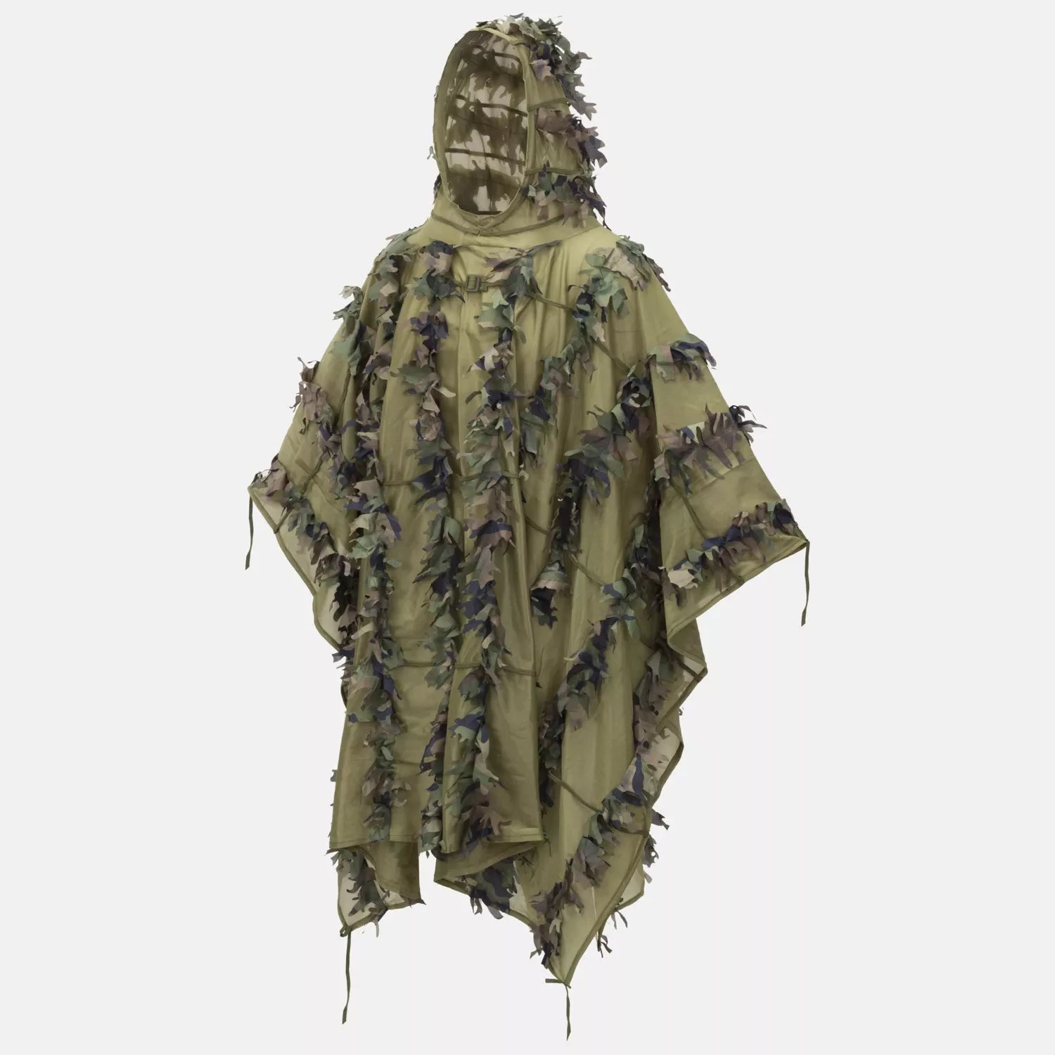 Ein ultraleichter und atmungsaktiver Ghillie‑Poncho mit beidseitig bedruckten 3D‑Blattimitaten im US Woodland‑Tarnmuster. Ideal geeignet zur Tarnung von Personen oder Beobachtungsposten in bewaldetem Gelände.