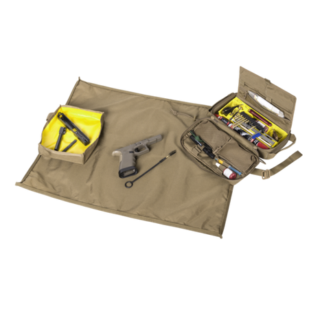 Ein echtes Highlight: Eine separate Reinigungsschale für das Dip-Reinigen von Kleinteilen (z. B. Handfeuerwaffen- oder Gewehrkomponenten) befindet sich unter dem Case, sicher verstaut in elastischen Schlaufen. Zusätzlich ist eine faltbare Reinigungsmatte dabei, die resistent gegen technische Flüssigkeiten ist – ideal für unterwegs und bei der Arbeit mit Sprayreiniger.