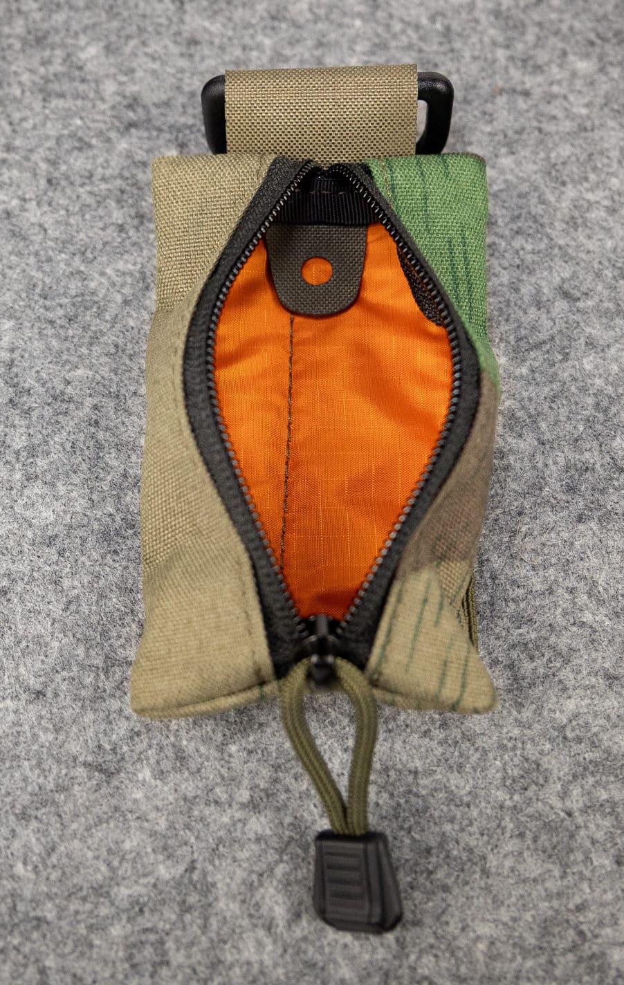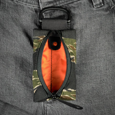 Innen bewährt sich der M.U.P. mit einem RipStop Nylon Futter in Signalorange, um den Inhalt immer im Blick zu haben. Desweiteren könnt ihr an der verbauten Schlaufe aus gelasertem Laminat Kleinteile mit einem Karabiner sichern. So geht nichts verloren, wenn der MUP geöffnet wird, natürlich nur mit einem Reißverschluss von YKK.