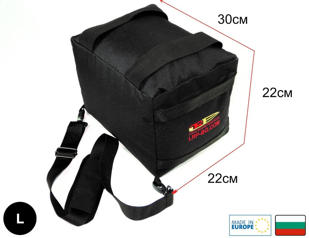 Mit seinem geringen Gewicht (0,500 kg) und seiner kompakten Größe (Höhe 22 cm, Breite 22 cm, Länge 30 cm) wurde der Big Bag L von T-Class-Wettkämpfern entwickelt, um Scharfschützen in den schwierigsten Situationen zu unterstützen, indem er die große Lücke an der Rückseite beim Schießen von einem Stativ, einer Barrikade, einem Dach und anderen schwierigen Positionen schließt.