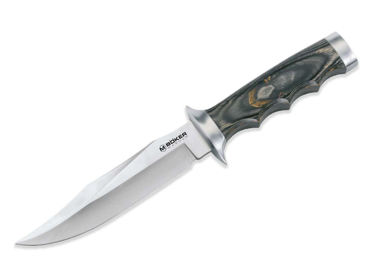 Das eindrucksvolle Magnum Jungle Devil ist ein zuverlässiges Jagd- und Kampfmesser mit einer robusten Bowie-Klinge aus rostfreiem 440A. Der Griff aus dekorativ gemasertem Schichtholz liegt dank der ergonomischen Fingermulden stets sicher in der Hand. Handschutz und Abschlussknauf werden aus satiniertem Edelstahl gefertigt und runden das Erscheinungsbild des Messers ab. Mit hochwertiger brauner Lederscheide mit Vortasche und praktischem Schleifstein.