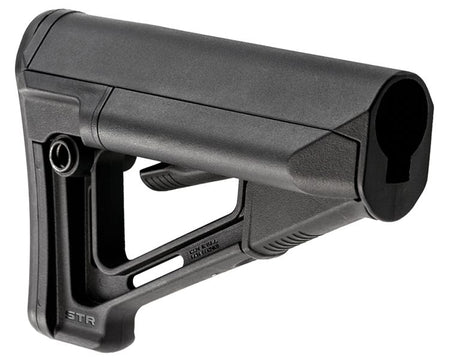 Der Magpul STR (Storage/Type Restricted) ist ein Drop-In-Ersatzschaft für AR15/ M4-Karabiner mit Mil-Spec-dimensionierter Verbindung. Der STR ist eine verbesserte Version des CTR®. Er verfügt über eine verbesserte Wangenauflage und zwei wasserfeste Batterie-Aufbewahrungsröhren auf einem kompakten, verstärkten Polymer-A-Rahmen. Die beiden wasserfesten Batteriefächer eignen sich für die Aufnahme von jeweils bis zu 2x CR123A Lithium- oder 1x AA-Batterien. Die Röhrchen sind von hinten über einen von Hand entfernbaren Gummistopfen zugänglich. Ein abgeschirmter Verstellhebel und ein zusätzliches Sperrsystem verhindern ein versehentliches Betätigen und minimieren übermäßige Lagerbewegungen, um die Stabilität und Genauigkeit der Waffe zu verbessern. Der STR verfügt über zwei integrierte und einen austauschbaren 0,30" dickes Gummipolster.