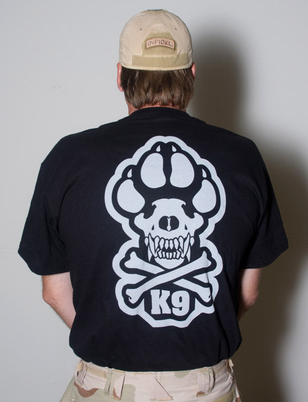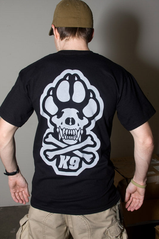 Derzeit als schwarze Shirts mit hellgrauem Aufdruck erhältlich. Großer Arsch K9 auf der Rückseite, kleine Pfote auf der Vorderseite.