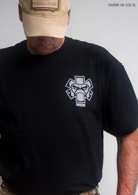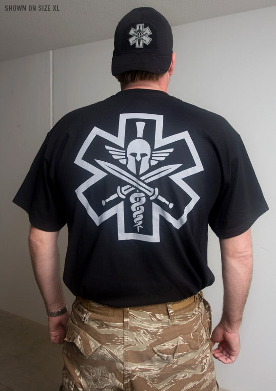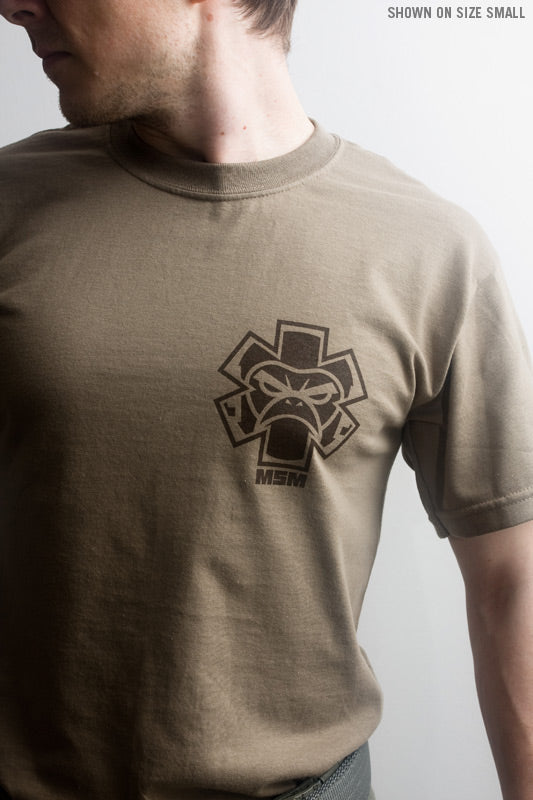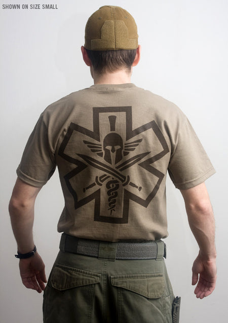 Tac-Medic Spartan-T-Shirt für die Sanitäter, die zurückschlagen. Erhältlich in off-weißem Druck auf schwarzen Shirts und dunkelbraunem Druck auf grünlich-braunen Shirts. Großes Arsch-Design auf dem Rücken und neues Sanitäter-Affensymbol auf der Vorderseite klein.