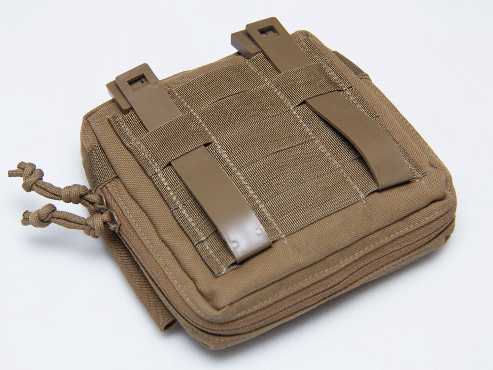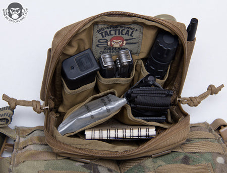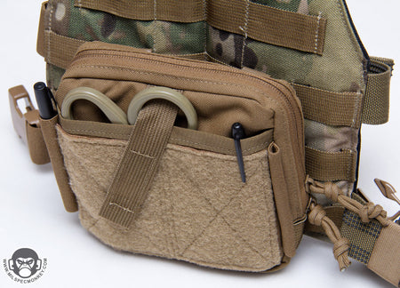 Basierend auf unserer "Stealth-Admin-Pouch" haben wir uns für eine etwas abgespecktere und vereinfachtere Variante entschieden. Die Reisverschlüsse lassen sich nun weiter öffnen um einen breiteren Zugang zum Hauptfach zu erhalten. Der Pouch hat 3 Taschen auf der Vorderseite und zwei weitere Taschen auf der Ärmeltasche der Innenseite. Es lassen sich verschiedene Werkzeuge, Multitools oder weitere Artikel wie z.B. Tourniquets und Bandagen problemlos aufbewahren. Das äußere Fach ist mit einem Sicherheitsriemen ausgestattet um einer Schere oder Notizen Halt zu bieten. Der Sicherheitsgurt kann in die Tasche gesteckt oder abgeschnitten werden falls er nicht benötigt wird. Um das fehlende Gurtband an den Seiten auszugleichen wurden elastische Stiftehalter hinzugefügt. 2x passende Malice-Clips enthalten