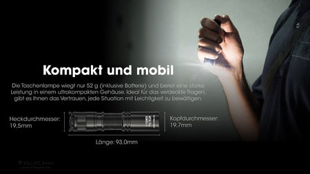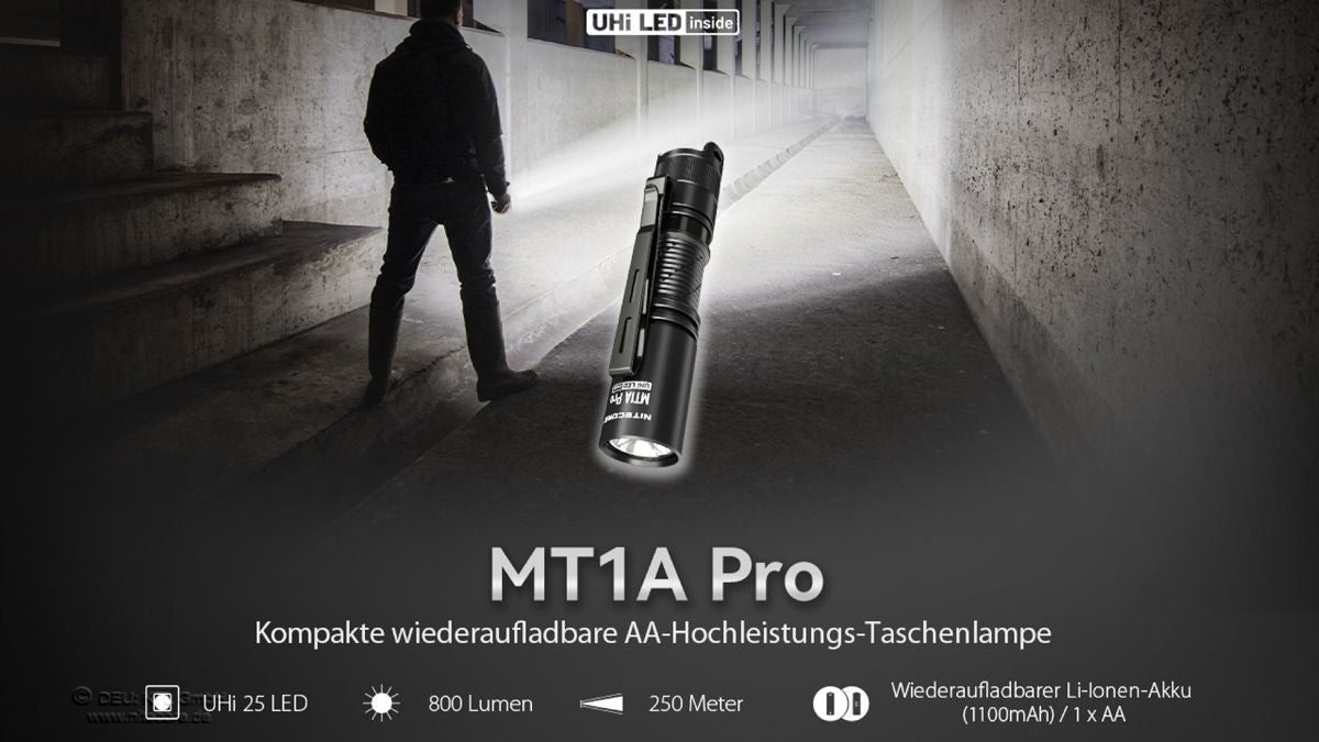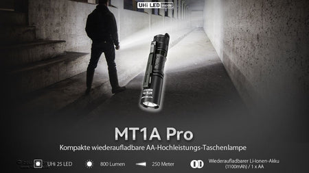 Mit der neuen MT1A PRO bringt Nitecore eine extrem kompakte und leistungsstarke Taschenlampe auf den Markt. Die MT1A PRO ersetzt die beliebte MT1A. Die erstmal verbaute NiteLab UHi 25 LED leistet bei Verwendung des NL1411R Akkus 800 Lumen. Der zum Lieferumfang gehörende NL1411R Li-Ion Akku kann auch gegen eine AA-Batterie ausgetauscht werden. Die Leistung der MT1A PRO reduziert sich dann auf 200 Lumen.