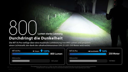 Dem Anwender stehen 3 Leuchtstufen zur Verfügung, sie werden durch leichtes Drücken des Heckschalters geschaltet. Mit dem Li-Ion Akku NL1411R erreicht die MT1A PRO eine Leuchtweite von ca. 250 Metern, mit einer AA-Batterie noch 125 Meter.