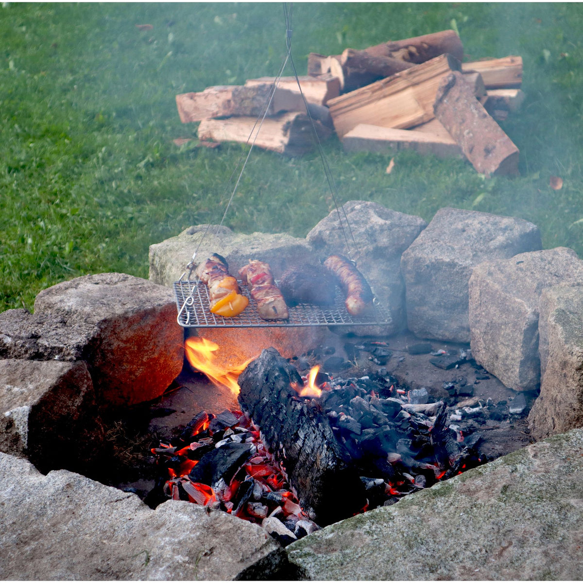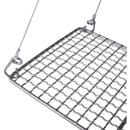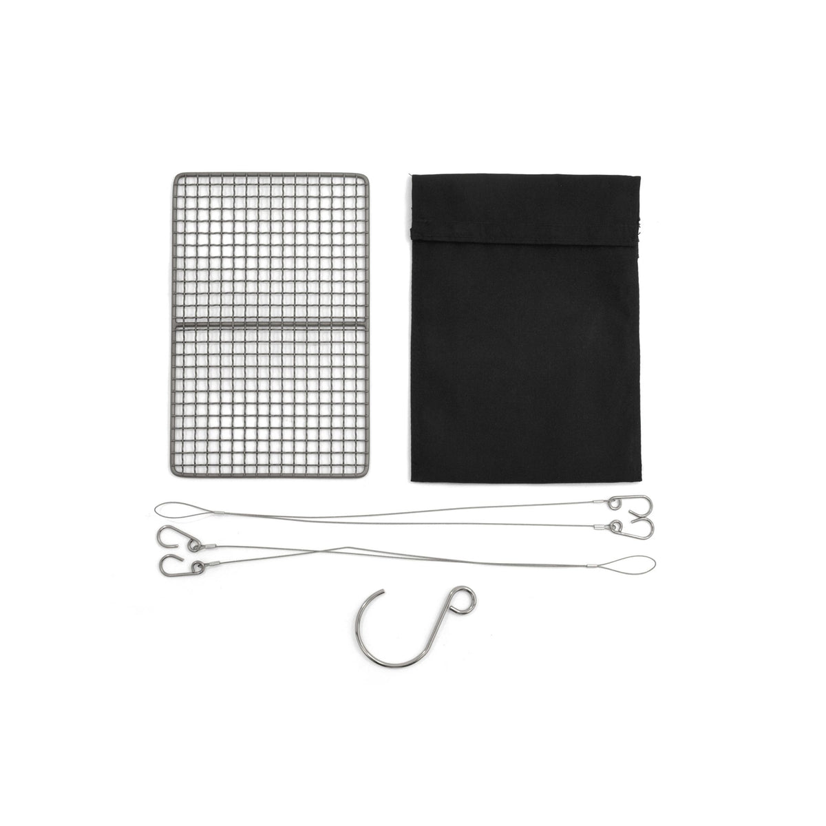 Ultraleichter, kompakter Grillrost aus Titan – vielseitig einsetzbar als Hängerohr über dem offenen Feuer oder als kleiner Kochtopfständer. Inklusive Edelstahl-(Aufhängungs-)Seile und Nylon-Transporttasche.