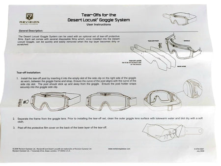 Das Desert Locust Goggle System kann mit einem optionalen Satz abreißbarer Schutzfolien verwendet werden. Diese kann nach dem Anbringen in der Desert Locust-Brille schnell und einfach wieder entfernt werden, falls die oberste Schicht verschmutzt oder zerkratzt ist.
