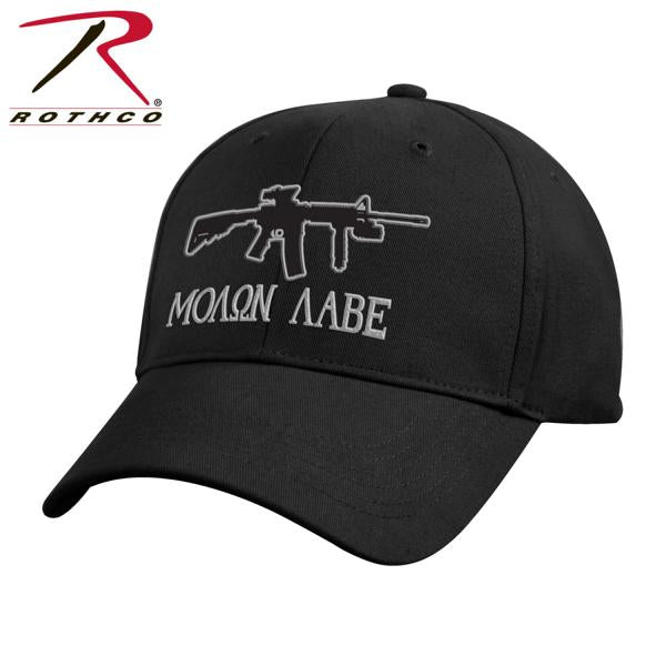Das Molon Labe Deluxe Low Profile Cap von Rothco ist auf der Vorderseite mit dem ikonischen Spruch und dem Gewehrmotiv in Silber bestickt. Molon Labe bedeutet übersetzt "Komm und nimm sie", ein klassischer Ausdruck des Trotzes.