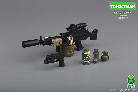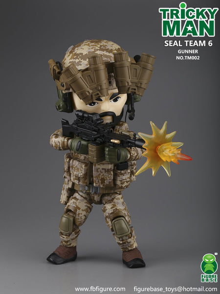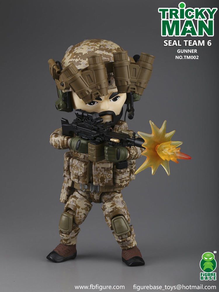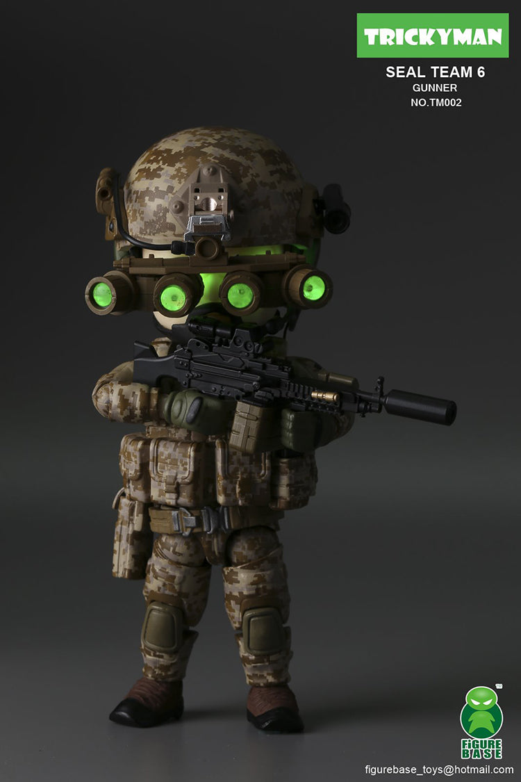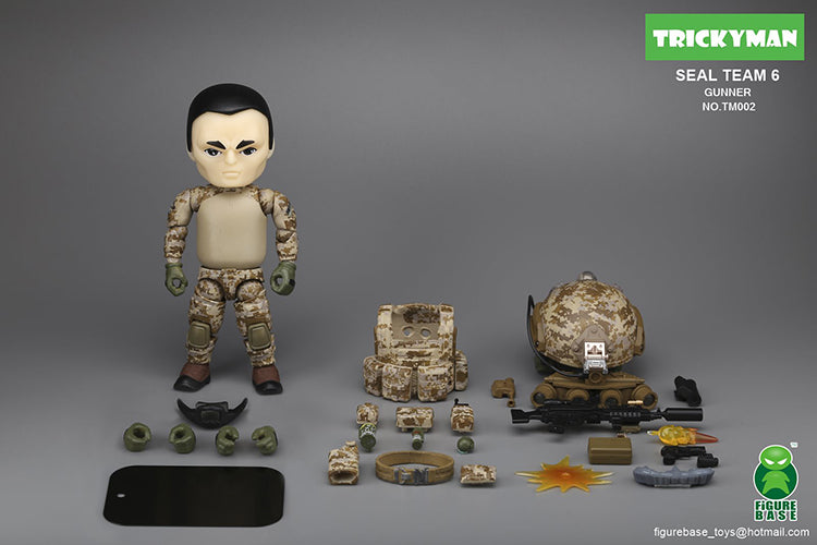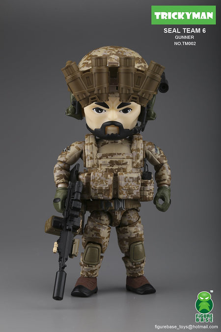 Der Trickyman TM001 Seal Team 6 Squad Leader von FigureBase ist eine 12,5 cm große, hoch stilisierte, super artikulierte Militärfigur. Der Schütze wird mit Zubehör einschließlich Waffen und austauschbaren Teilen einschließlich abnehmbarem Bart geliefert.