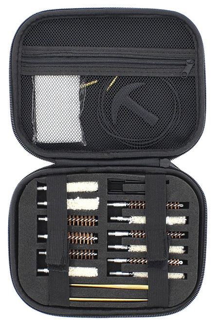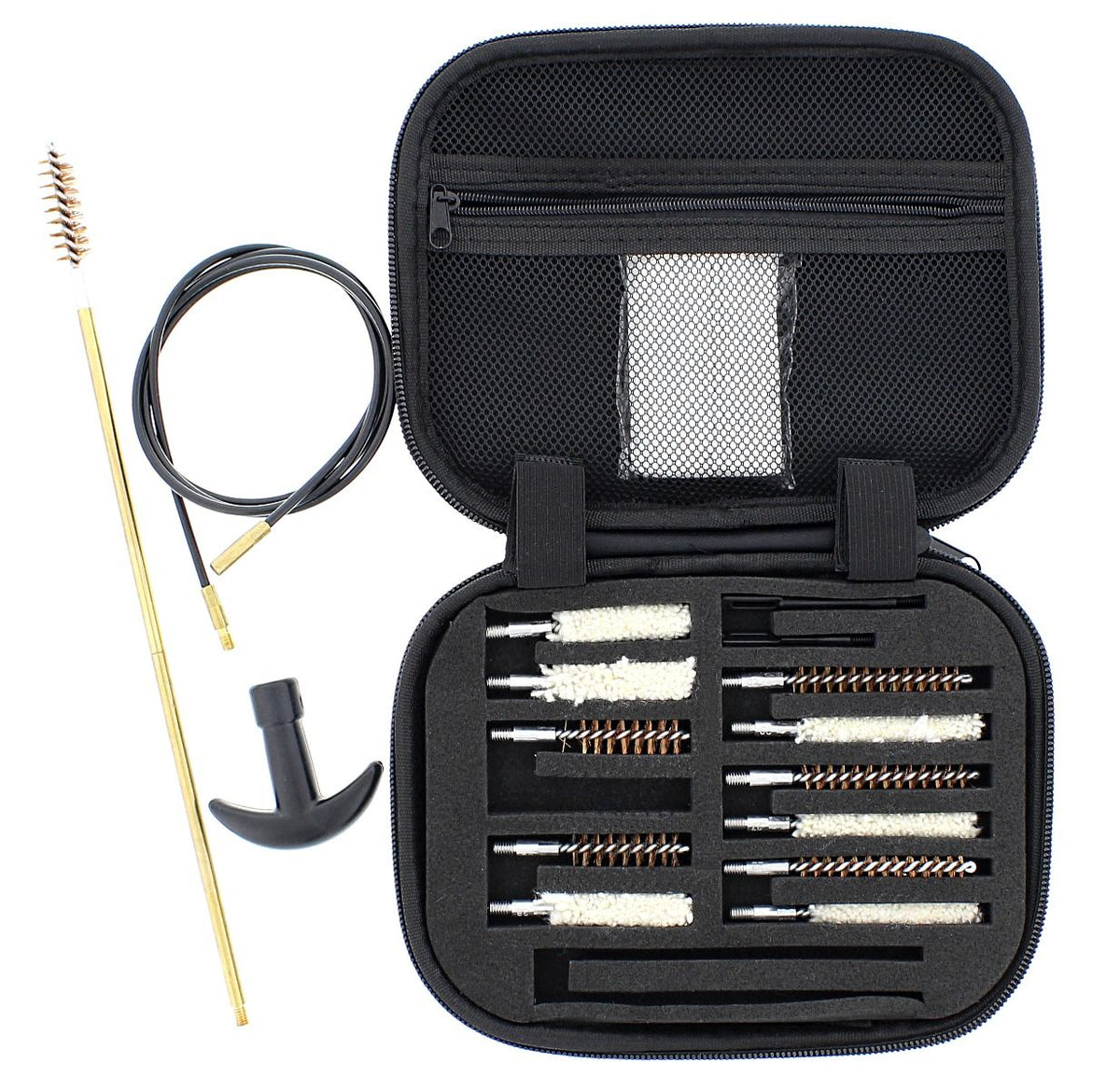 bestehend aus einem 99 cm langen mit Kunststoff überzogenen Stahlseil für Langwaffen,einem zweiteiligen 21,5 cm langen Messingstock für Kurzwaffen und einem Griff für Seil und Stock.Pro Kaliber finden Sie eine Kupferbürste für grobe Verschmutzung, eine Wollbürste für leichte Verschmutzung und zwei unterschiedlich große Werghalter. Lieferung im stabilen Etui mit Reißverschluss. Geeignet für Kaliber .30 / 7,62 mm, .270 / 6,8 mm, .22 / 5,6 mm, .44-.45 / 11,43 mm, .40 / 10 mm, .357-.38 / 9,6 mm
