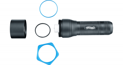 Das Set umfasst drei verschiedene Farben: Schatten-Schwarz, Walther-Blau und Night-glow (Nachleuchten durch Phosphoreszenz), damit die Walther Pro-Leuchte in der Dunkelheit leicht zu finden ist.