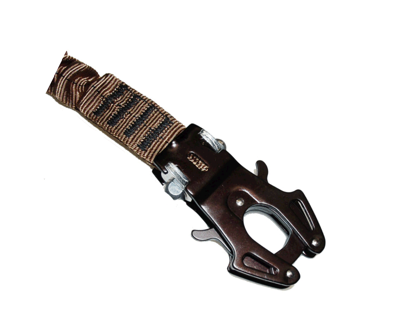 Für die Verwendung als persönliches Sicherungsseil in einem Hubschrauber. Einzigartiger Kong Frog-Schnellverschluss-Mechanismus an einem Ende (Stärke 22kN) zum direkten Einhaken in Hubschrauber-Bodenringe. Gebaut mit 4000lb. mil spec 5625 röhrenförmigem Gurtband. Lanyard Nennfestigkeit 3400 lbf. (15kN). Die Lanyars sind jetzt mit dem MFG-Datum und der 15 kN-Bezeichnung gekennzeichnet. Der Kong Tango Karabinerhaken mit doppelter Verriegelung entspricht den Standards der NFPA 1983/2006 Edition. Festigkeit 7425 lbf. (33kN). Hergestellt in den USA.