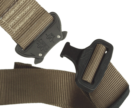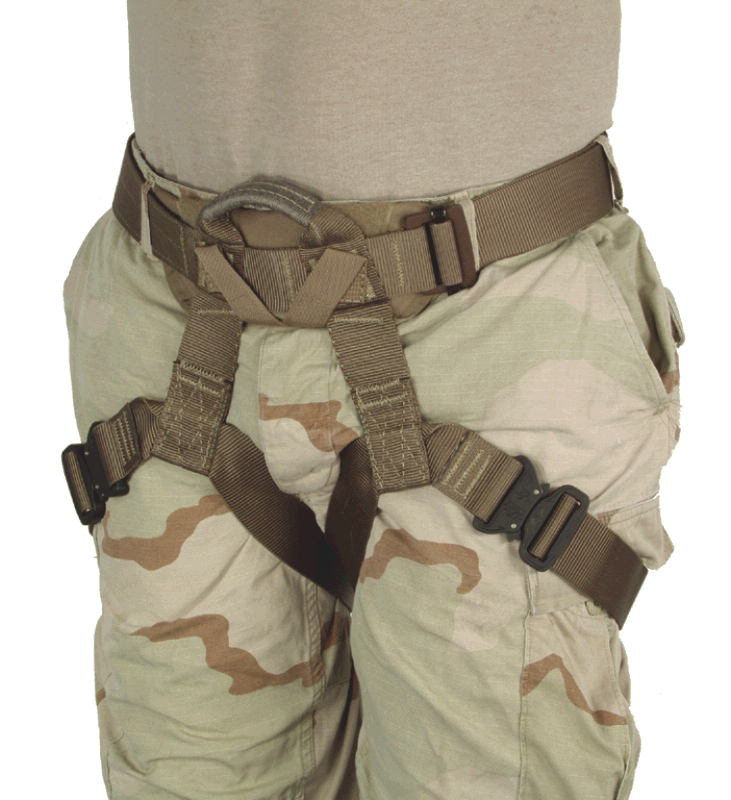 Dieser Gurt wurde in Zusammenarbeit mit militärischen Spezialeinheiten entwickelt und wird als Dienstgürtel an der BDU des Benutzers getragen. Im Gürtelbereich des Gurtes ist ein Versteifungsband eingenäht, um den seitlichen Arm des Trägers zu unterstützen. Die Beinteile können schnell angelegt werden, indem die Tasche geöffnet und die Beinschlaufen mit Cobra-Schnellverschlussschnallen aus Aluminium befestigt werden. Der Befestigungspunkt des Gurtes ist für alle Abseil- und Ausziehsituationen gut geeignet. Gewicht 1 lb. 6 oz. NEU - HÜFTGURT-Teil des 304C-Gurtes wird jetzt mit "Operational Camouflage Pattern" (OCP)-Gewebe hergestellt.