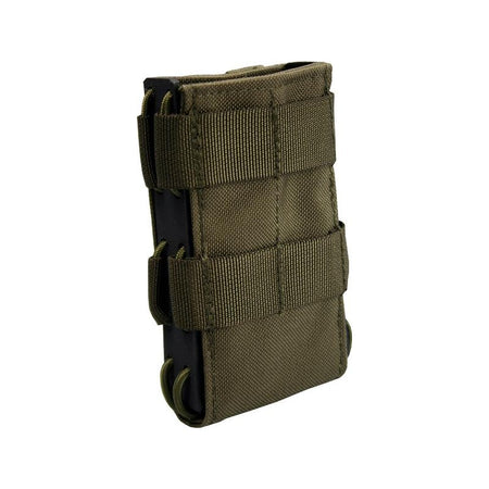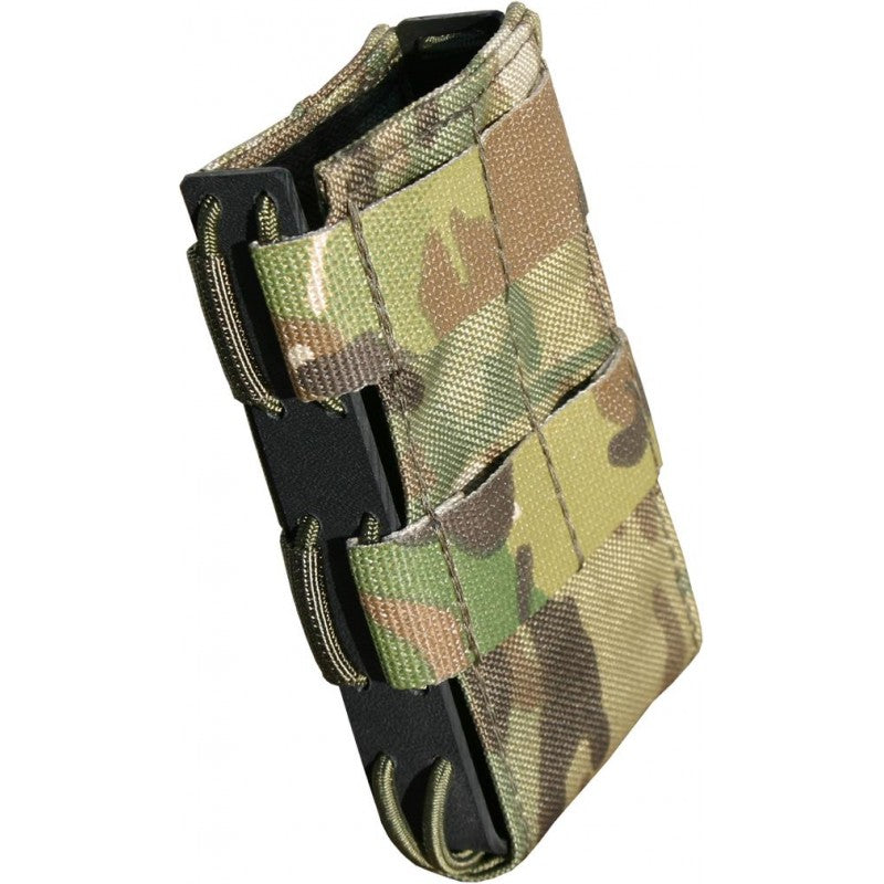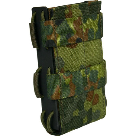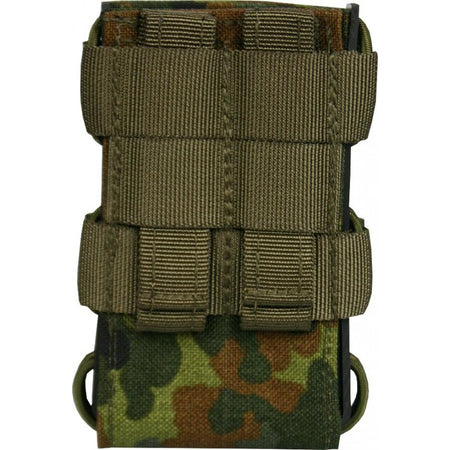 Die Zentauron Schnellziehlösung für das M4, M16, Steyr AUG, SA80, FN-FAL und viele andere gängige Magazine mit 5,56 mm NATO Kaliber. Ein sicherer Halt des Magazins sowie die schnelle Zieh- und Rückführungsgeschwindigkeit werden durch ein mit Gummischnüren zusammengedrücktes Kydex® Profil erreicht. Dadurch ist dieses Produkt einzigartig auf dem deutschen Markt. Eine mit PAL´s besetzte Cordura® Front ermöglicht das Anbringen modularer Taschen.