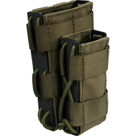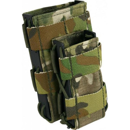 Die Schnellziehtasche M4 Duo aus unserer Artemis Serie ist eine Kombination aus einer Magazintasche für eine Langwaffe mit einer vorgesetzten Magazin-asche für eine Kurzwaffe. So hat der Anwender die Möglichkeit schnell im Einsatz von der einen zur anderen Waffe zu wechseln, und das Magazin zu tauschen. Um einen sicheren Halt der vorgesetzten Pistolenschnellziehtasche zu gewährleisten, ist diese fest an die hintere Tasche angenäht. Wie bei einzelnen Schnellziehtaschen verfügen beide über ein Kydex®-Profil, das eine hohe Formstabilität und Ziehgeschwindigkeit ermöglicht. Kunststoff und textile Bauteile werden mit stabilen Gummikordeln verbunden und verhelfen den Taschen so zu einer einzigartigen Flexibilität.